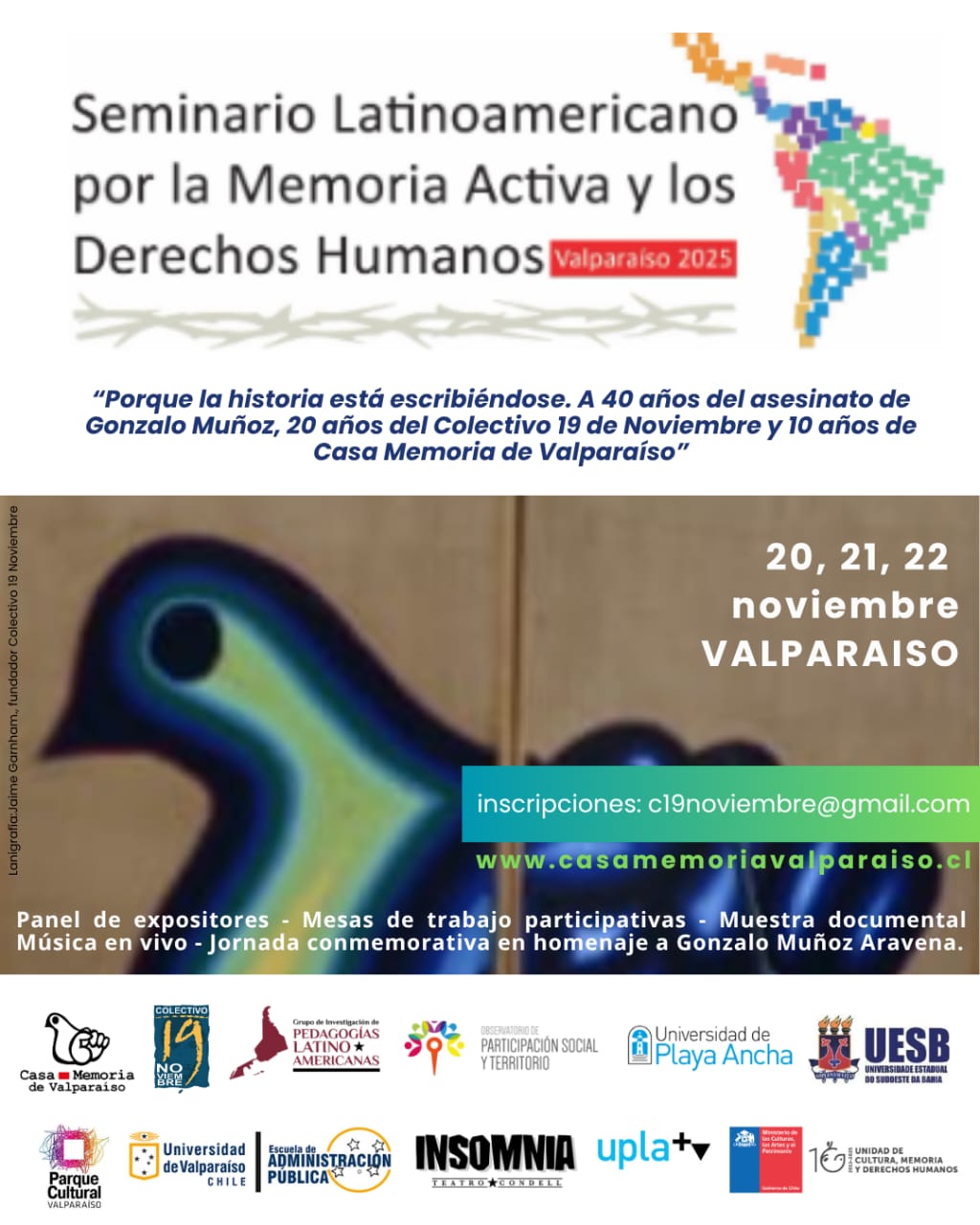 A 40 años del asesinato de Gonzalo Muñoz, 20 años del Colectivo 19 de Noviembre y 10 años de la Casa Memoria de Valparaíso, este seminario busca abrir el diálogo entre experiencias latinoamericanas que defienden la verdad, la justicia y los derechos humanos desde el arte, la educación y la comunidad.